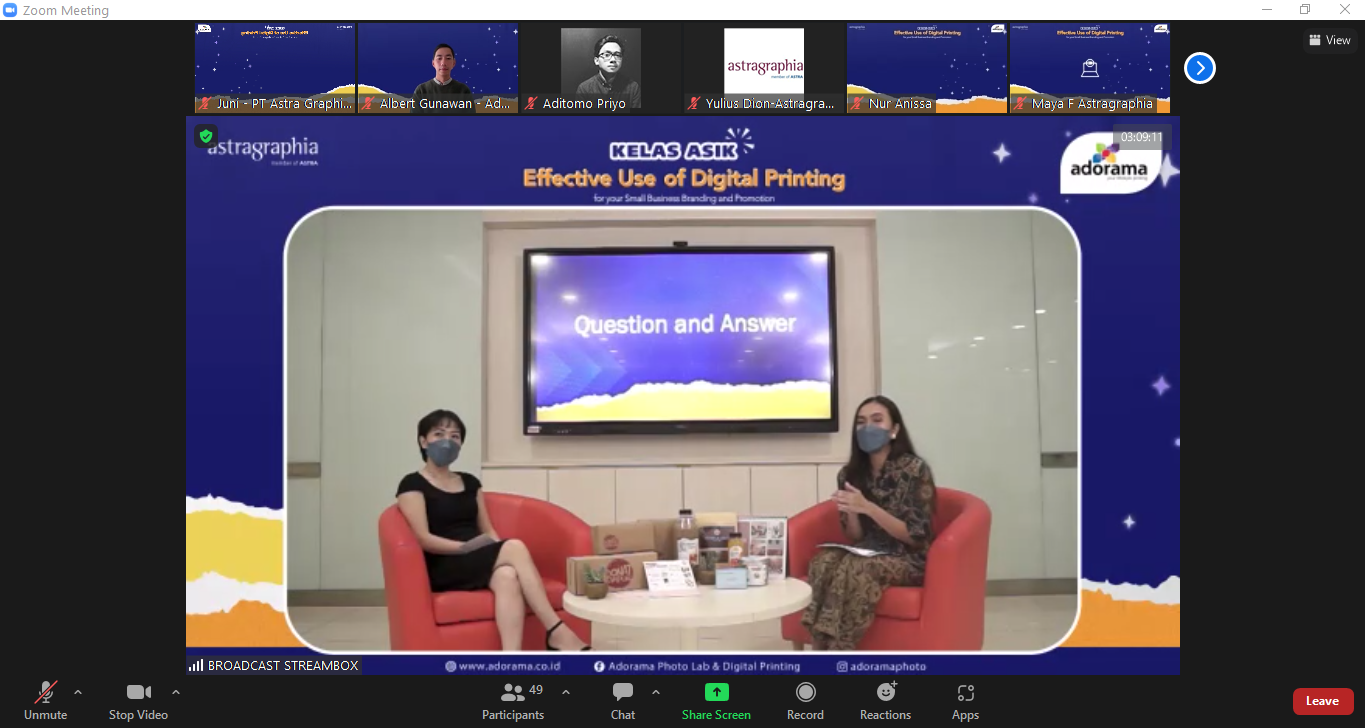 The three speakers received good responses from all UMK participants. Question after question was asked by the participants to each resource person. This shows that MSEs always want to continue to improve the quality of their products, especially through improvements in terms of packaging. As a form of appreciation for Astragraphia and Adorama to ASIK Class participants, participants with selected questions are entitled to merchandise. Not only that, Adorama also prepared door prizes for three lucky participants to get digital print vouchers worth Rp600,000.